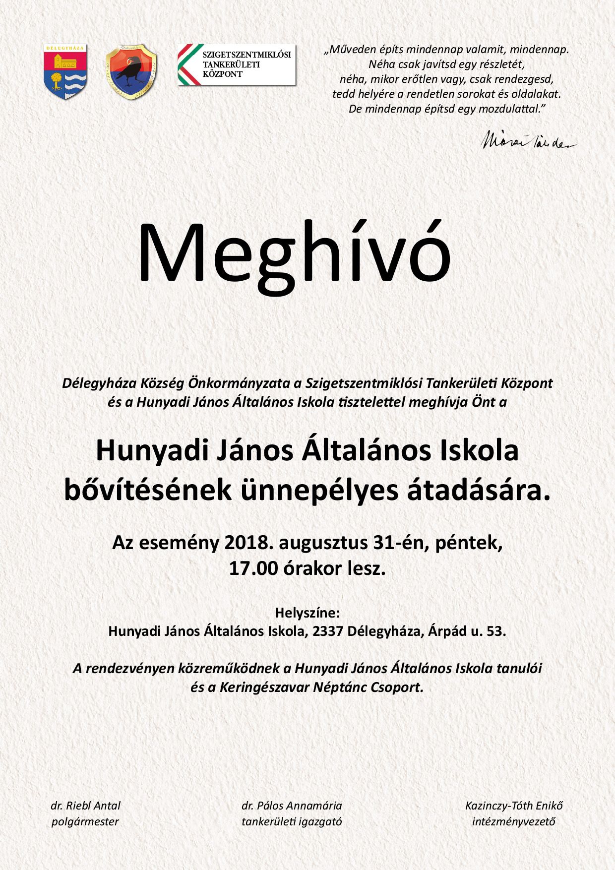 Hunyadi János Általános Iskola ÁtadóMegjelent: 2018. augusztus 30. csütörtök, 07:36 | Nyomtatás | E-mail